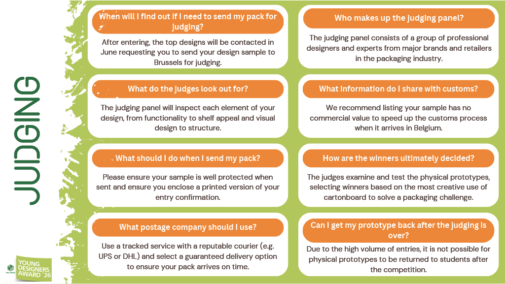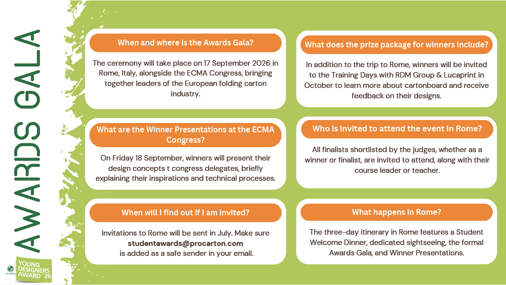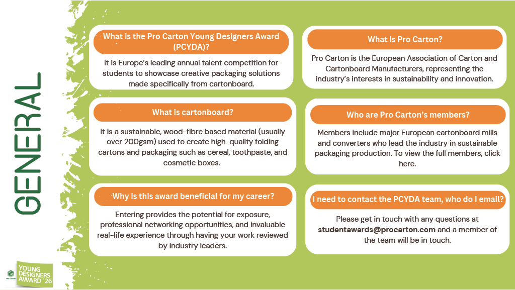 Der Wettbewerb Pro Carton Young Designers Award richtet sich an alle Designstudenten in Europa, die nicht beruflich tätig sind. Die Teilnehmer müssen zum Zeitpunkt der Teilnahme noch immatrikuliert sein.