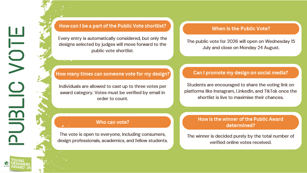 Im Anschluss an die Jurysitzung werden die ausgewählten Entwürfe auf einer öffentlichen Abstimmungsseite auf der Pro Carton-Website vorgestellt, die auf unseren Social-Media-Kanälen, darunter Facebook, X, Instagram, Pinterest und LinkedIn, beworben wird. Jeder ist eingeladen, seine Stimme abzugeben. Jede Form von Manipulation von Stimmen führt zur Disqualifikation.