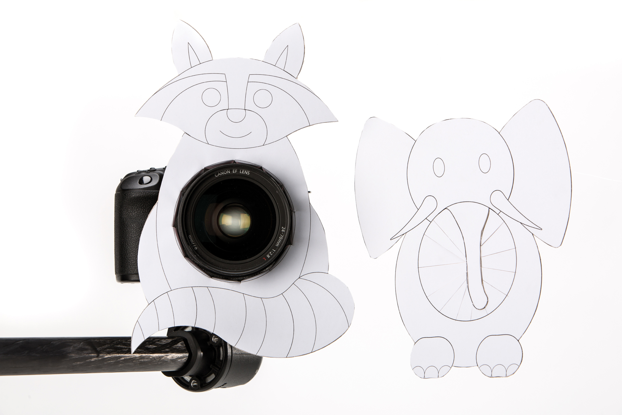 As soon as the parents are arriving in the studio or on location, the child gets the cardboard to draw on it. While the parents and the photographer are speaking about the procedure, the child is personalizing the racoon or the elephant by crayoning it and giving it a name. Afterwards it is positioned on the lens. If the photographer wants the child to look into the camera, he/she asks the child to look to the elephant or the racoon and uses the name chosen by the child. The child looks to the crayoned animal and by this into the camera.