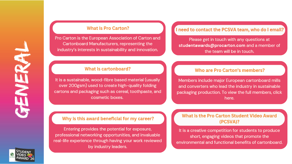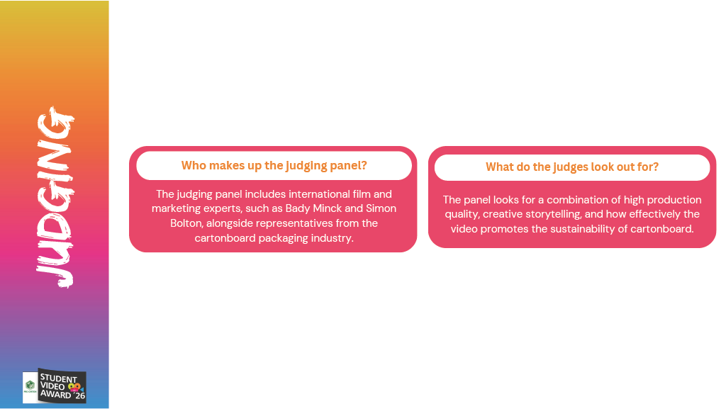 Your video must showcase the benefits of folding carton or cartonboard, and the PCSVA 2026 award logo must be featured in the final sequence of your film. Other than that, be as creative as you like!