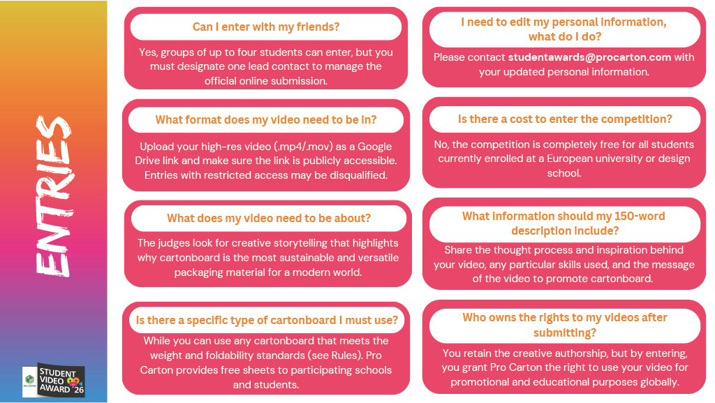 If circumstances allow, the winner(s) will be invited to the Pro Carton award celebrations in September 2026. Travel expenses and accommodation covered. If you enter as a group, please be aware that only one person will be invited to the Awards Gala.