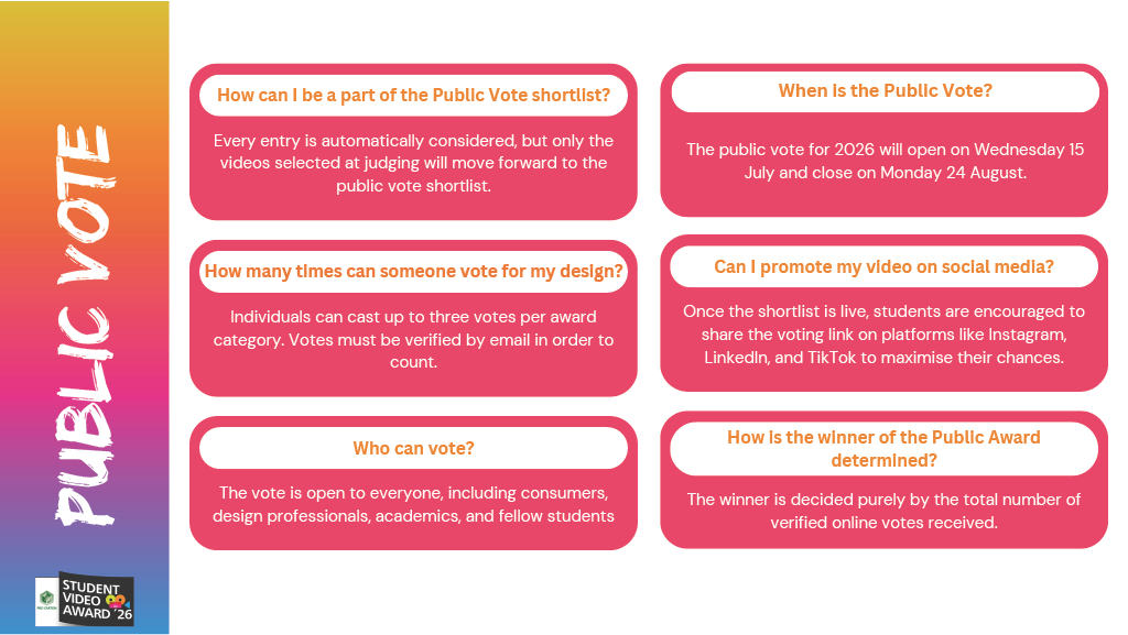 By submitting a video, you give the organisers the right to showcase the submitted concepts publicly including in the Awards Brochure, exhibitions, publications and all other promotional documentation and media relevant to the competition.