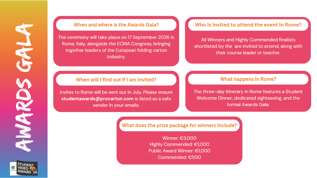All winners and their teachers will be invited to the Awards Gala in Rome, Italy 2026 to network with leading producers of cartonboard and folding cartons.