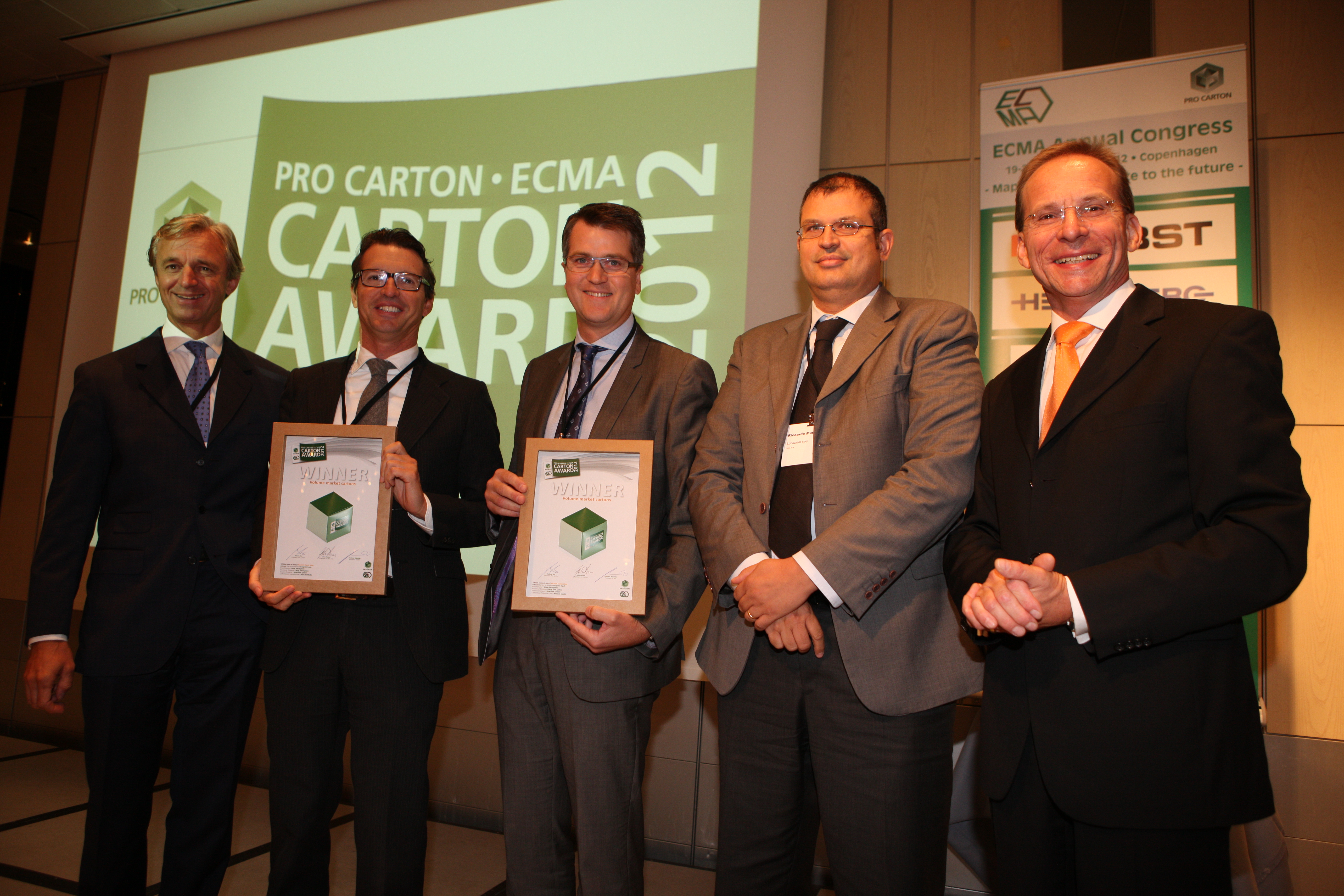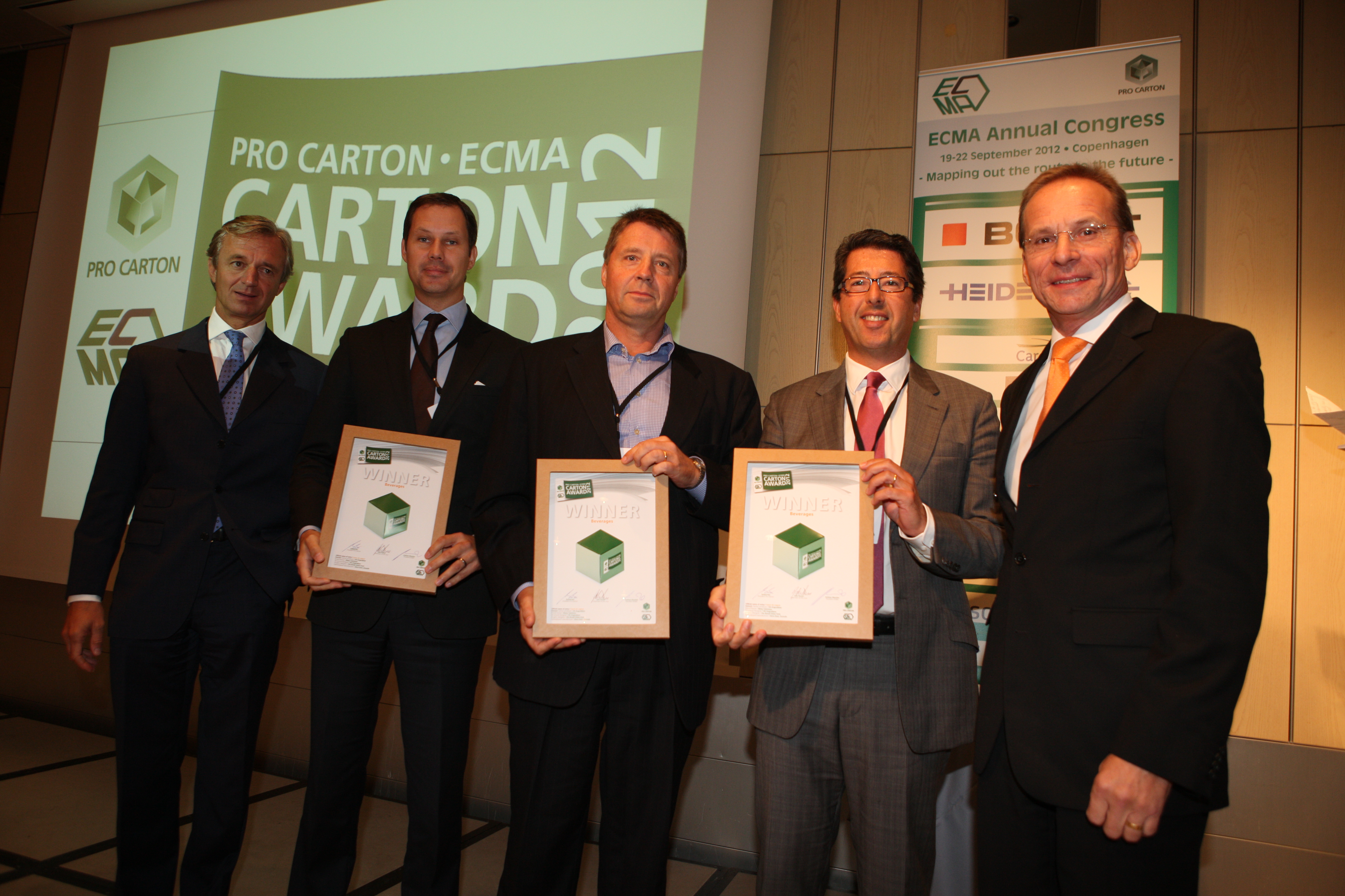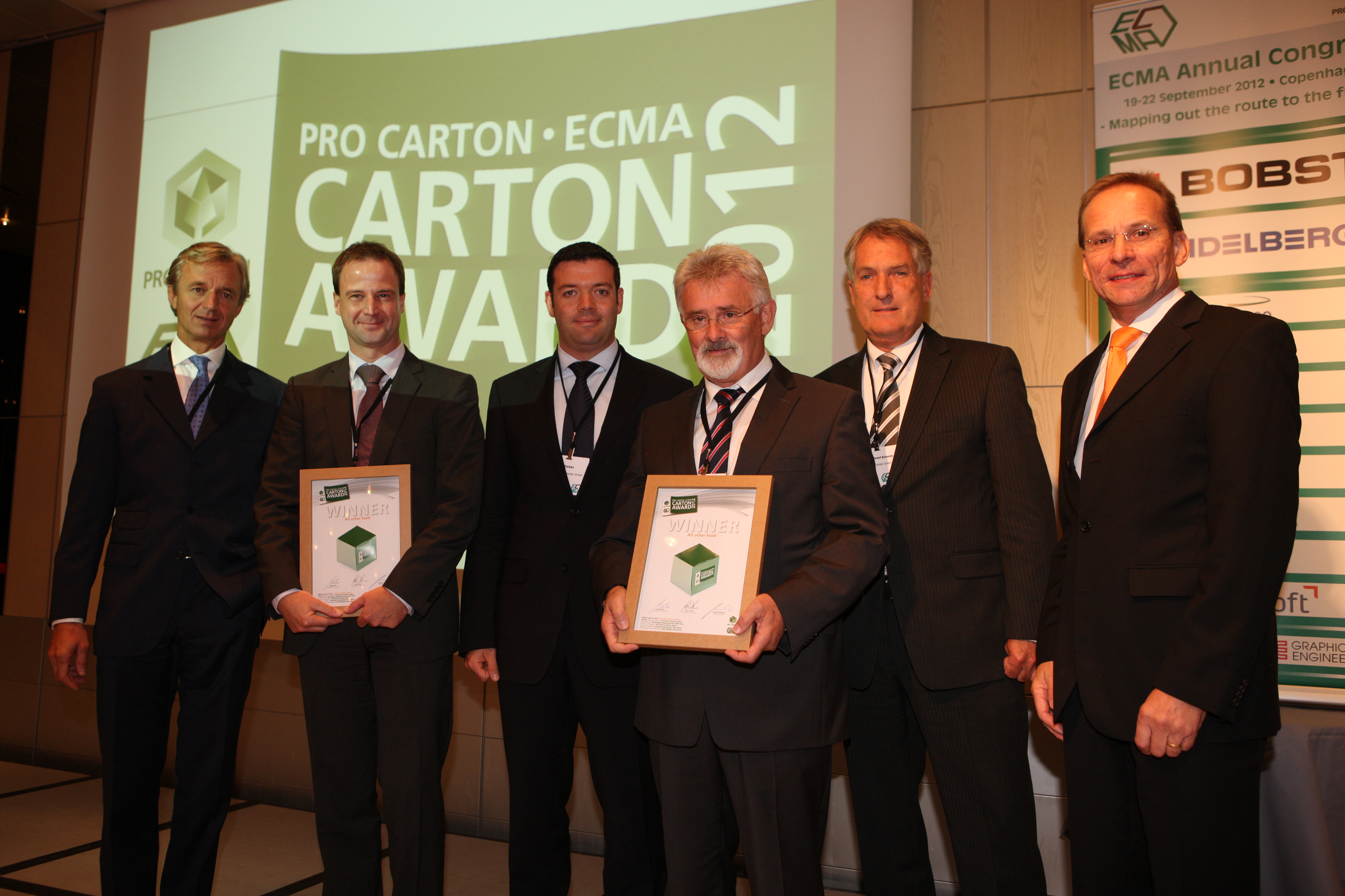 | Der jährlich verliehene Pro Carton/ECMA Award ist eine der renommiertesten Auszeichnungen in seiner Kategorie und wird nun schon zum 16. Mal verliehen. Mit dem Preis werden Verpackungen ausgezeichnet, die sich auf dem Markt bewährt haben. Zum ersten Mal stand der Wettbewerb allen Partnern der Lieferkette offen: Karton- und Faltschachtelherstellern, Designern, Markeninhabern und dem Einzelhandel. Verliehen wurden die Preise am 20. September 2012 auf dem ECMA-Kongress in Kopenhagen verliehen. Der Preis für Carton of the Year ging an die Champagnerverpackung Taittinger Rose Lens von Van Genechten. |