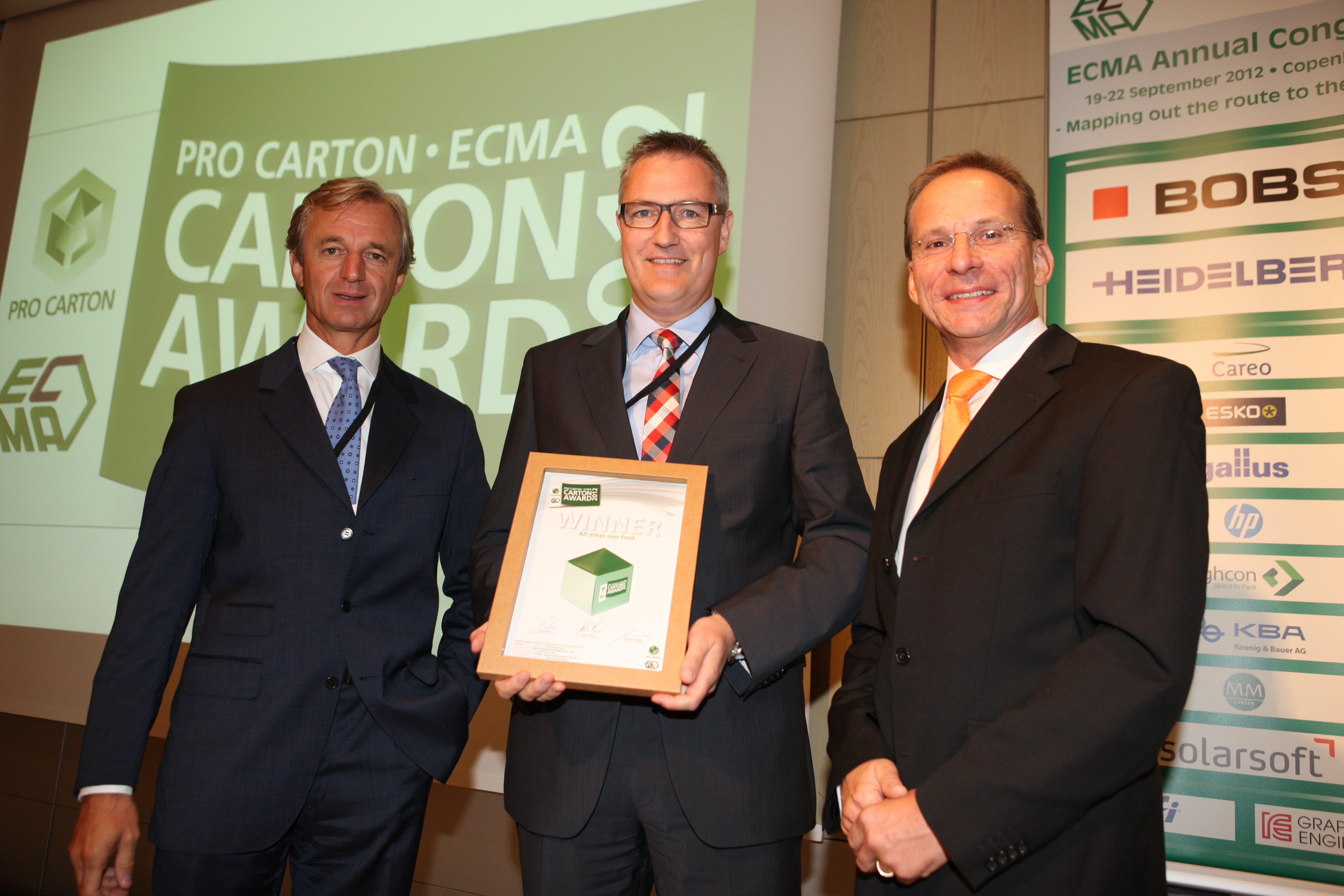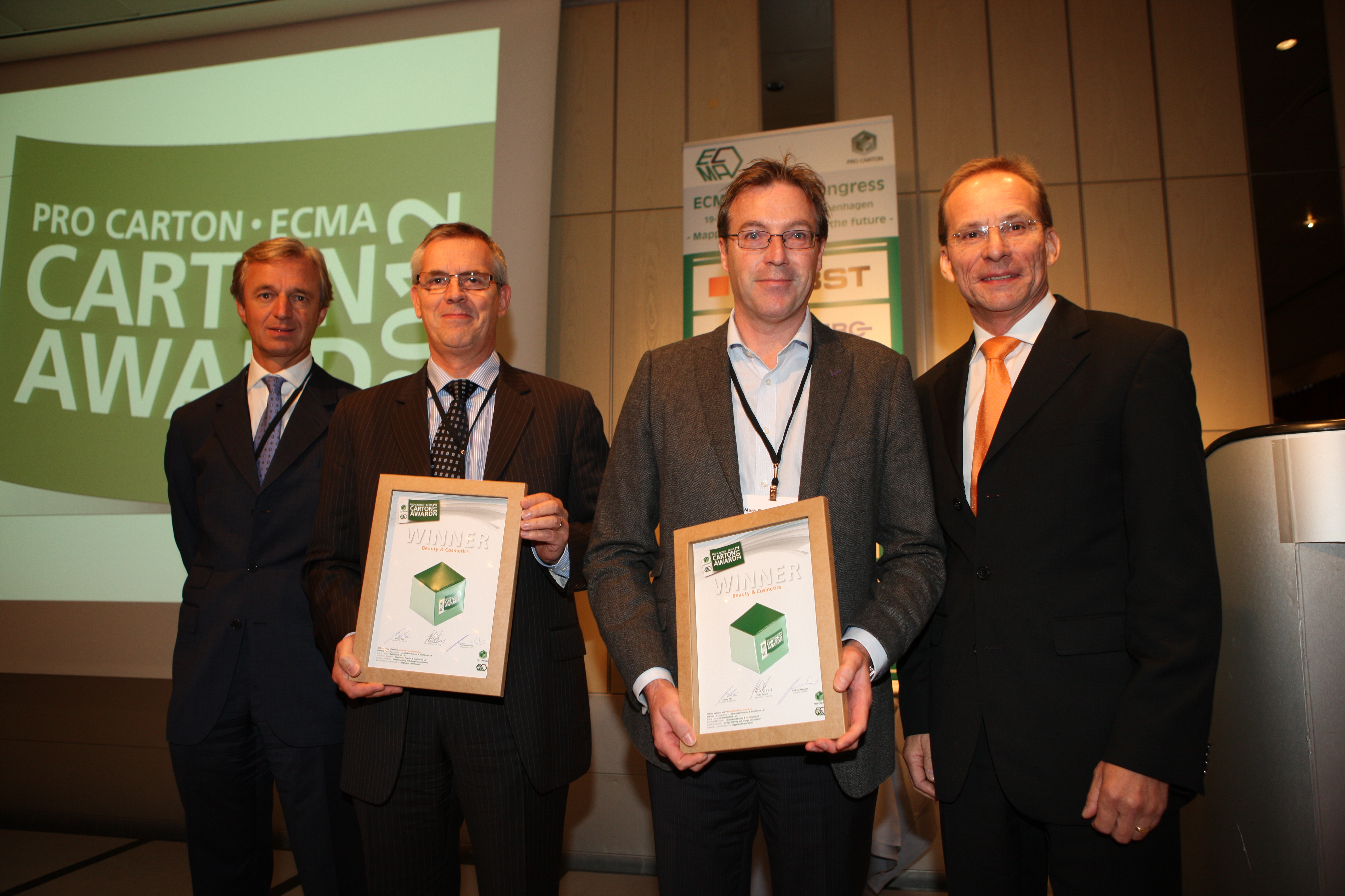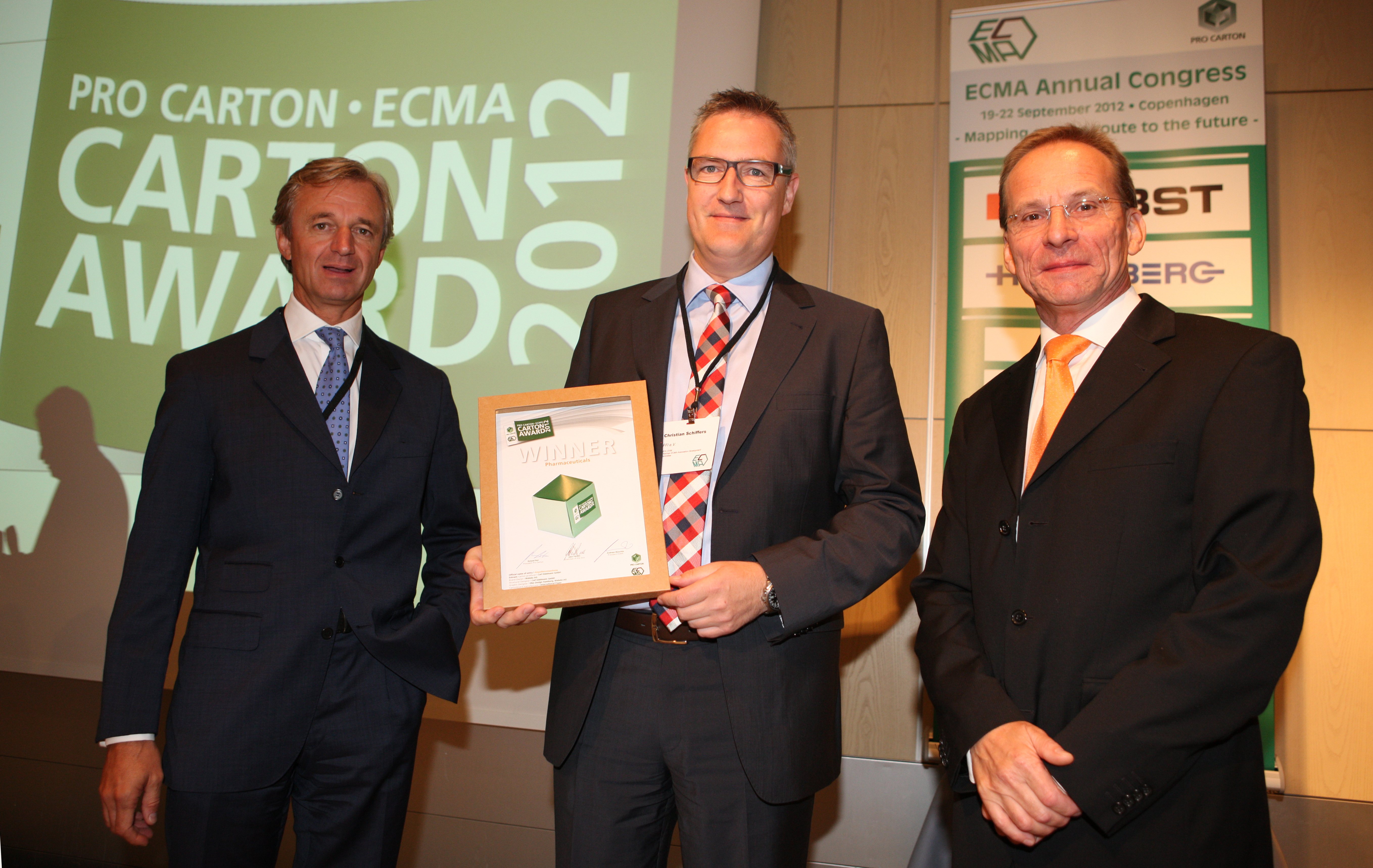 | Der jährlich verliehene Pro Carton/ECMA Award ist eine der renommiertesten Auszeichnungen in seiner Kategorie und wird nun schon zum 16. Mal verliehen. Mit dem Preis werden Verpackungen ausgezeichnet, die sich auf dem Markt bewährt haben. Zum ersten Mal stand der Wettbewerb allen Partnern der Lieferkette offen: Karton- und Faltschachtelherstellern, Designern, Markeninhabern und dem Einzelhandel. Verliehen wurden die Preise am 20. September 2012 auf dem ECMA-Kongress in Kopenhagen verliehen. Der Preis für Carton of the Year ging an die Champagnerverpackung Taittinger Rose Lens von Van Genechten. |
