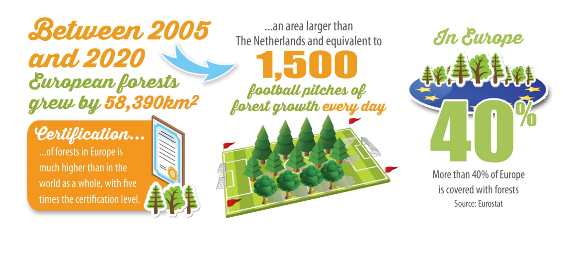 Die Karton- und die Forstindustrie unterhalten eine harmonische und wichtige Beziehung. Mehr als 90% der in der europäischen Papier- und Kartonindustrie verwendeten Holzfasern stammen aus EU-Wäldern, davon mehr als 78% aus nachhaltig bewirtschafteten und zertifizierten Wäldern(1). Die europäische Waldfaserindustrie ist verpflichtet nachhaltige ForstwirtschaftFür jeden geernteten Baum werden 2 bis 3 neue gepflanzt, so dass zwischen 2005 und 2020 eine Fläche von 58.390 km2 entstehen wird. So wächst jedes Jahr mehr Holz nach, als geerntet wird, was einer Fläche von 1 500 Fußballfeldern pro Tag entspricht. Die aktive Wiederaufforstung wird von allen Mitgliedern der europäischen Papier- und Kartonindustrie voll unterstützt.