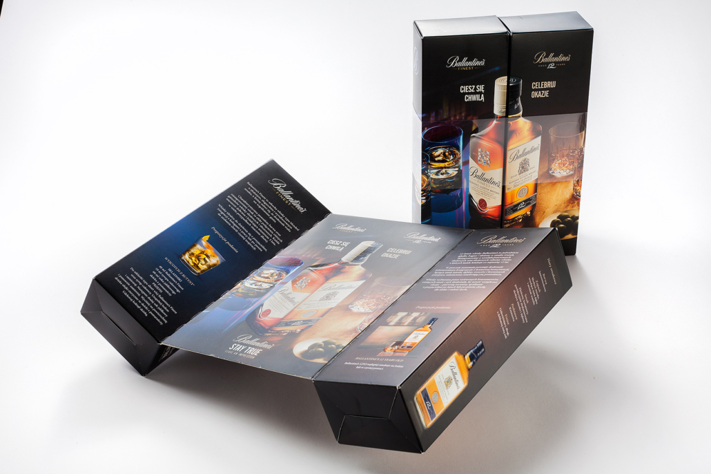 The toned, dark graphics with colourful, shiny accents and fine embossing are associated with the premium whiskies inside. The packaging opens like a book, revealing its secrets – instead of one bottle there are two. Flaps hide the cut edges, lids made with several layers of folded board, special gluing and premium material make this packaging exceptional. The packaging is machine glued, manually erected, filled and presented as a special, noble gift box for all whisky fans.