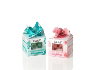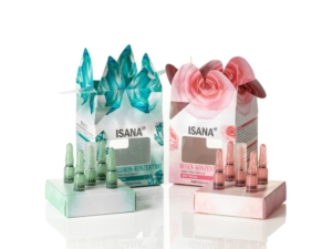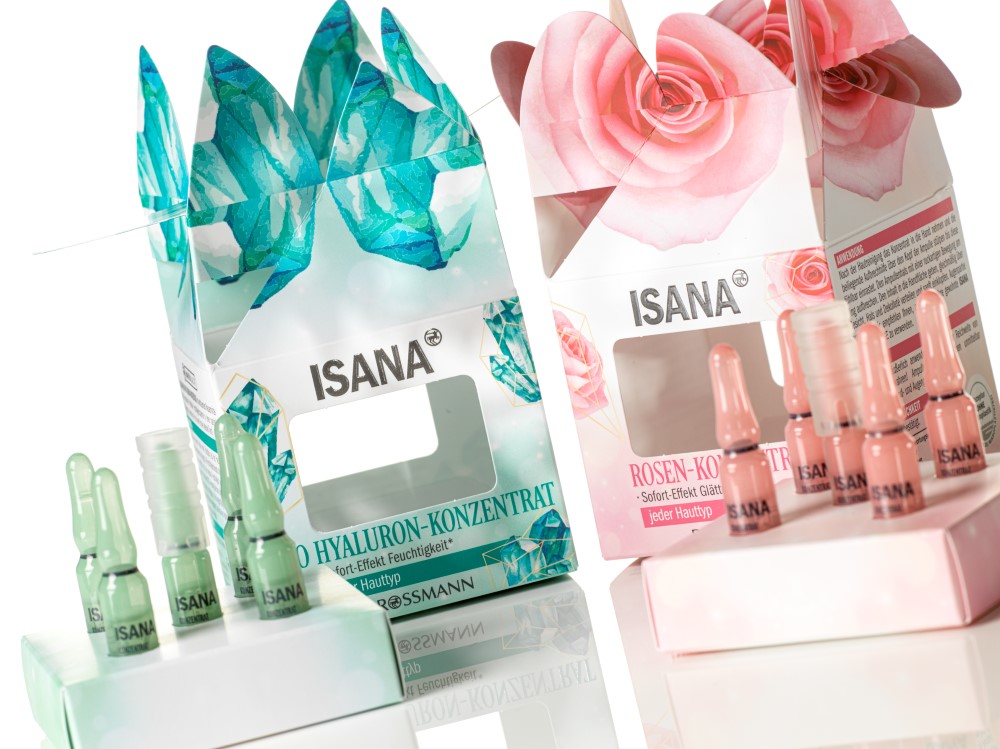 These cartons made of mono-material cartonboard attract everyone’s attention. The attractive graphics, both inside and out, are completed with an elaborate top closure. The embossed ISANA logo adorns the front, where the rose and a diamond grid creates a further highlight. Rounded windows give a view of the five ampoules inside.