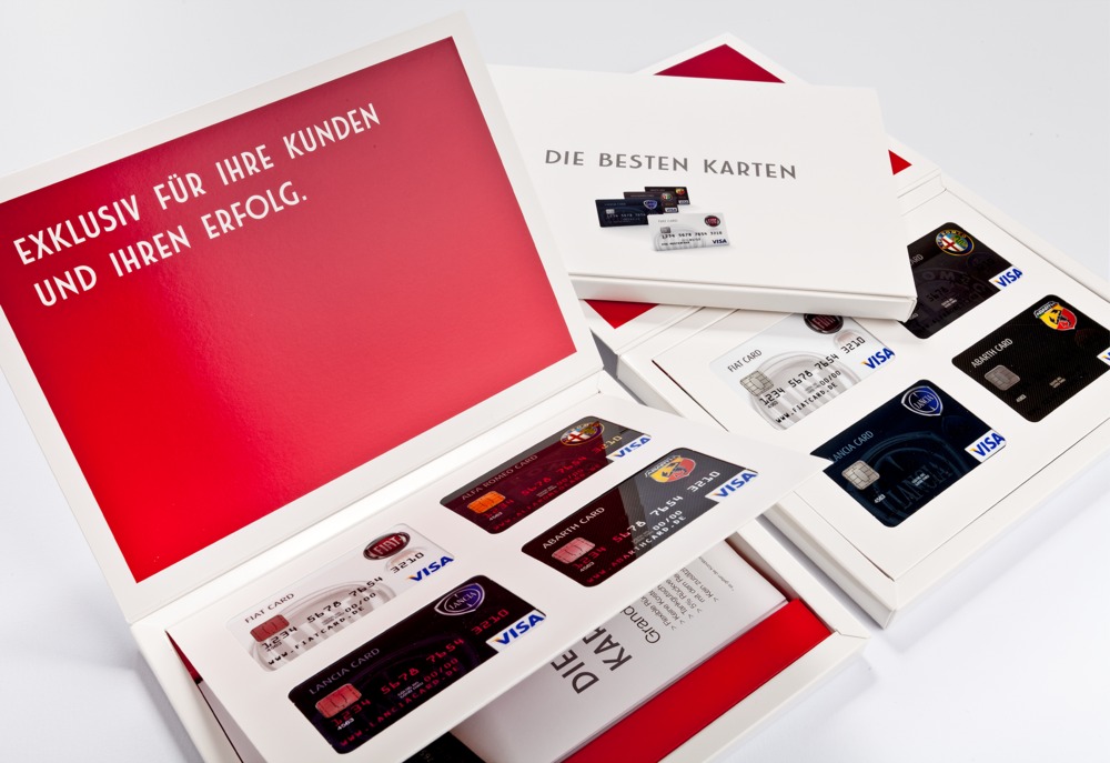 The high quality presentation of credit cards for the automobile trade also offers a tactile experience. All the important elements for the target group “dealers” are combined in a single pack and replace time-consuming information events.