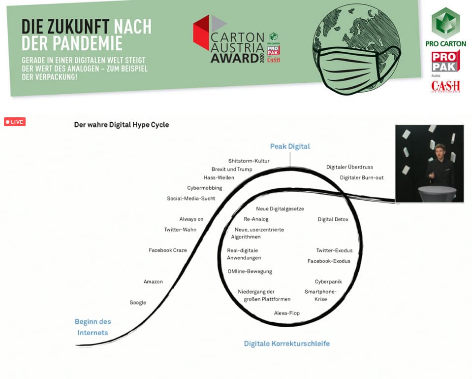 Por primera vez, el presidente de Pro Carton, Horst Bittermann, ha invitado a los asistentes a los eventos de marketing de PROPAK Austria en Livestream. En el primer año de la asociación establecida, PROPAK Austria, la revista CASH Handelsmagazin y Pro Carton organizan conjuntamente el evento de marketing. El experto en tendencias Tristan Horx explicó cómo se desarrolla la actual crisis de las tendencias y qué lugar ocupa el cartón. Los ganadores del último Carton Austria Award no se conformaron con su éxito.