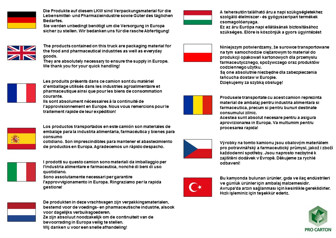 Aquí tiene un cartel sugerido que puede enviarse con las mercancías y también entregarse a los camioneros para que lo utilicen en el despacho de las fronteras. Está en 10 idiomas.