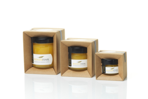 This high-quality organic honey called for a unique, enhancing pack. The folded frame not only protects the honey from light but also from transport damage. With the brown rear side turned inside out, the cartonboard communicates a focus on sustainability and nature. On the inside of the cartonboard, the world of bees opens up in print. The shape perfectly spotlights the product, the cartonboard frame is designed to work with as little material as possible and entirely without glue.