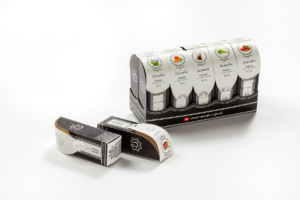 This type of packaging is distinguished by a premium-quality finish and absolute precision in processing. The relatively small packaging, which was produced in 30 different variants, features a premium finish, thus communicating the high quality of the liquid inside. A small tray holds ten of the packaged liquids. Various finishing techniques were applied on an extremely small packaging printing surface: hot foil stamping, special relief varnish and UV gloss varnish.
