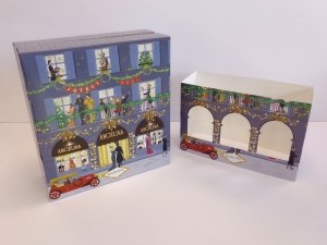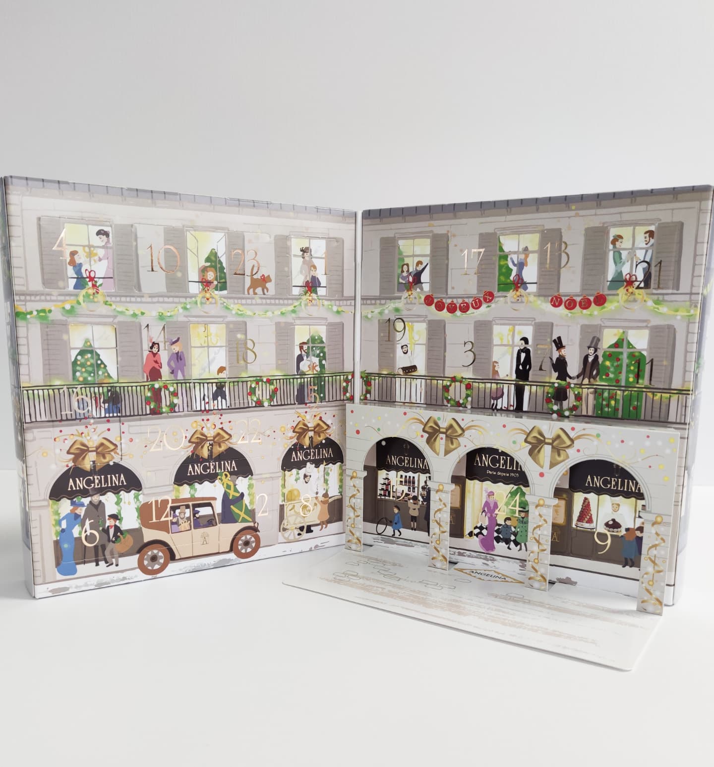 This diptych calendar is presented closed with a sheath. When opened, the double hinged box becomes a refined Christmas decoration with an integrated pop-up of the famous Arcades. The quality of virgin fibers and printing is accentuated by hot foil. It contains 24 surprise Advent sweets to appreciate throughout the days of Advent. These sweets of various shapes are packaged in a suitable cushioning ecological and innovative cartonboard replacing the usual plastic blister.