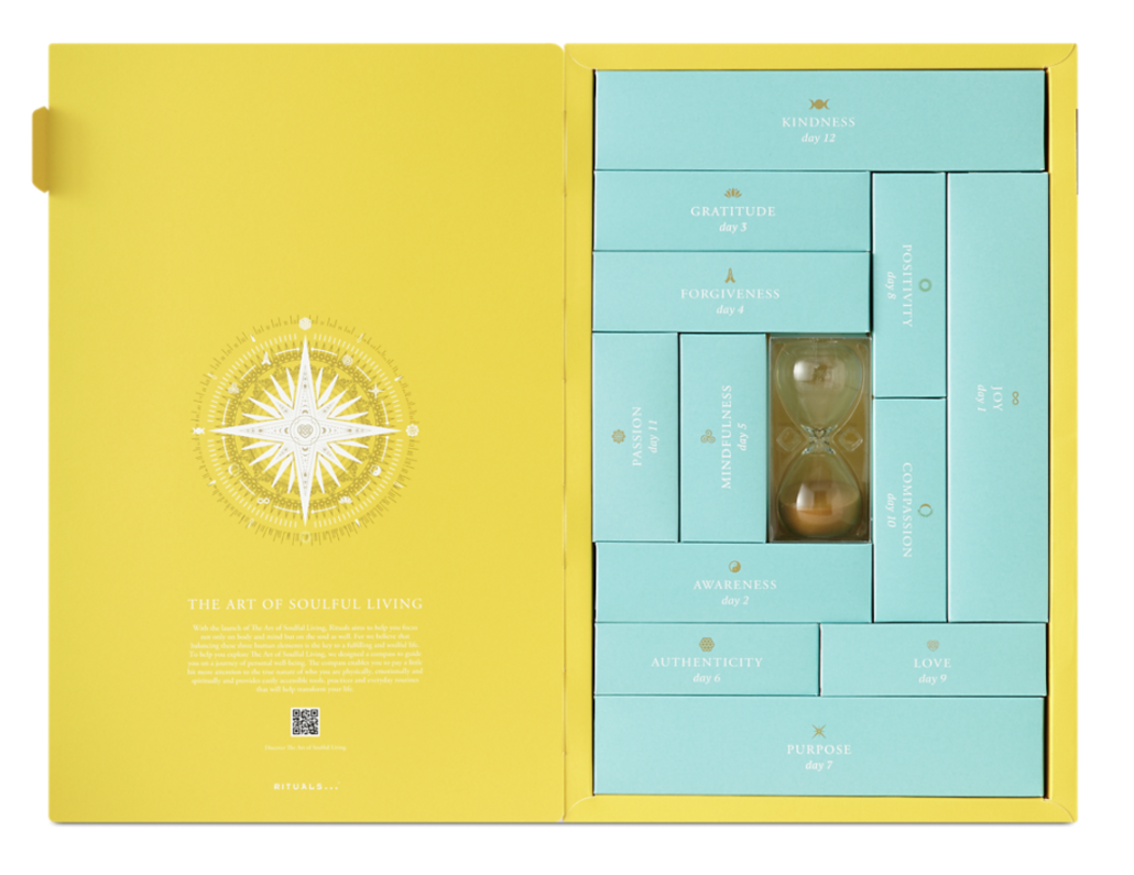 The art of soulful living is a giftbox to promote 15 minutes ”me-time” every day. To highlight the contents, a natural touch and feel was important for this concept. Premium virgin fibre boards create enough strength, while the all-over fabric structure embossing, combined with the matt dispersion varnish, generates the natural touch and feel. Hot foil is used perfectly to highlight this personal gift. The closing lid is constructed as a separate element to give the consumer the option to use the box without it, once opened.