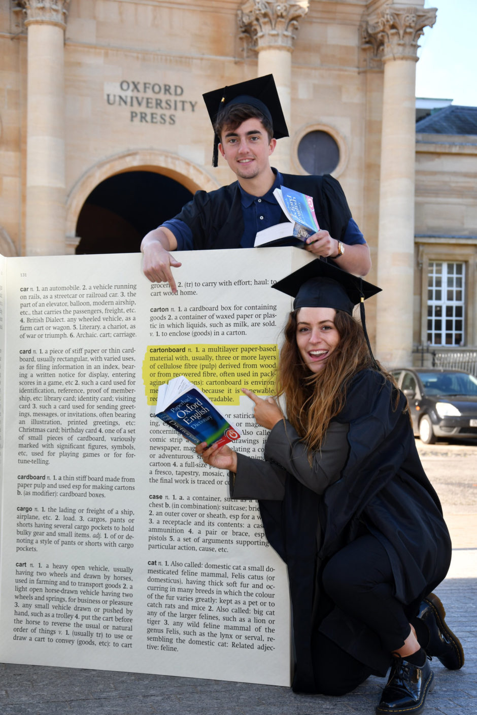 Oxford est bien connue pour être le siège du savoir et ses bibliothèques abritent plus de 12 millions de livres et de manuscrits. Cependant, peu d'entre elles sont aussi grandes que le dictionnaire géant en carton qui a atterri dans les rues de la ville cette semaine, dans le cadre d'une campagne visant à faire reconnaître officiellement le mot "carton" dans l'Oxford English Dictionary. Ce dictionnaire plus grand que nature d'un mètre cinquante est entièrement fabriqué en carton renouvelable, recyclable et biodégradable.