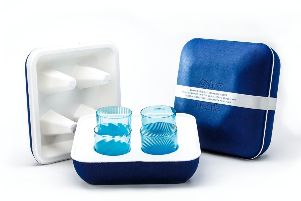 High-quality and sophisticated transit packaging made from a fibre suspension of cardboard waste to hold four hand blown Murano glasses. The specific challenge was to fix the water glass to the glass bottom and to enssure that the thin-walled glass edge will not be touched by the packaging. Extensive drop tests were carried out to test that the glass would remained undamaged.