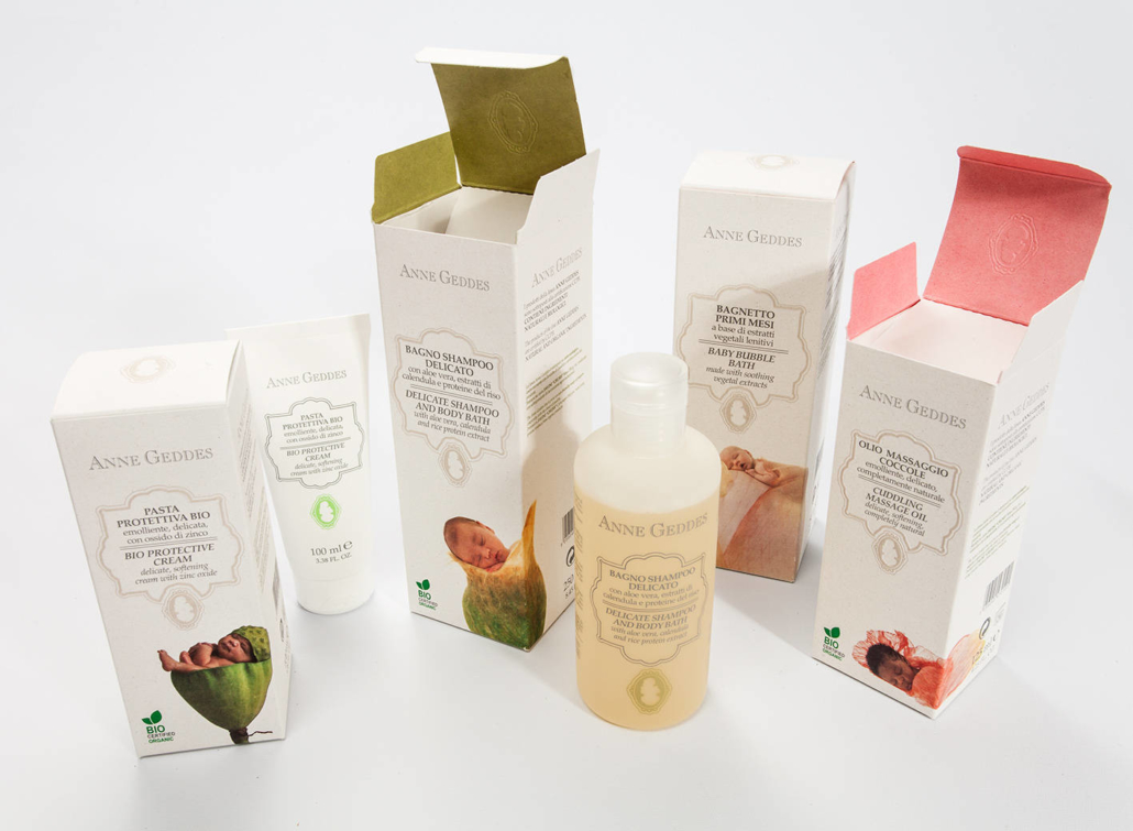 The objective was to create a 100 % natural packaging which fits the Anne Geddes brand and product range. The result is an elegant “green” carton, embossed and printed both inside and out. The colour, with minute “natural” specks, gives the packaging a sympathetic, ecological look. The tactile feel is also exceptional as the raw material consists of agro-industrial waste products, which gives an “organic” impression.