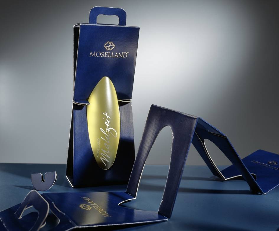 After long deliberation the Jury felt that it should honour this entry with a special award. The display package stood out because of its contemporary design. The construction fits all wines of the same brand family. Its dark blue design with gold embossing harmonises with the goldcoloured frosted glass bottle and as such enhances the visibility of the brand on the bottle. At the same time, it also protects the bottles from touching each other during transport. The integrated handle allows easy and safe transport.
