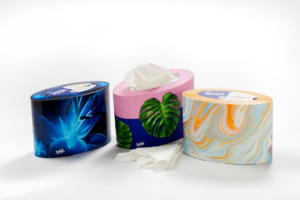 A unique, oval tissue box in highly attractive colours with all-round decorative sophistication, where functionality and elegance go hand in hand. Dispensing the product is extremely easy. The oval shape is unique and the first of its kind for this type of product on the cosmetics market. The consistent use of cartonboard makes this carton fully recyclable.
