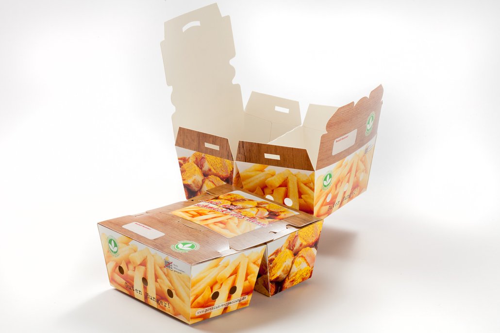 A one-piece, pre-erected dual compartment box for food service, where the content is separated into two compartments to prevent the chips being soaked with sauce from the curry sausage. The compartment for the curry sausage has no holes and therefore the sauce is kept inside, whereas the chips compartment has several holes to keep the chips crunchy and to allow water vapour to escape. Closed, it is safe for carrying. The packaging can be produced on a standard high-speed erecting line (with some modifications) and has not been seen in this segment before.