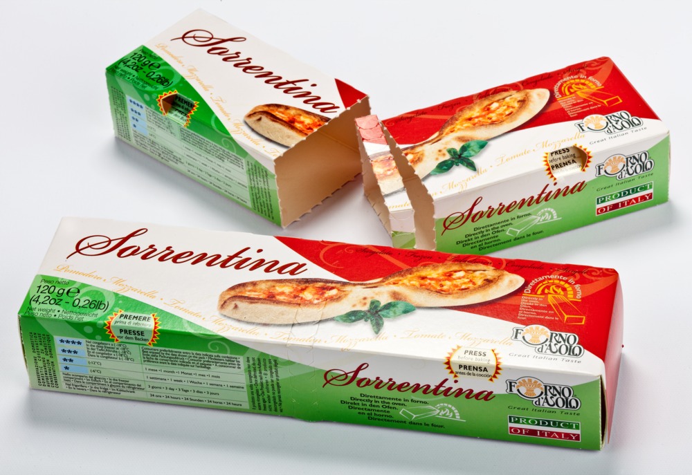 An excellent concept that worked well and delivered exactly what it was designed to do. Often this type of packaging works well but then using it when the food is hot can be a problem. By having a tear strip in the middle of the carton, when the pannini was cooked the carton can be removed from the oven, split in two and then used to hold the hot pannini. In addition two small push perforations had been added to allow air to escape safely whilst being heated but without the risk of contamination during shipping.