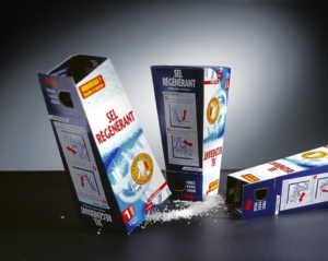 The package was designed in such a way that the salt could be put in the reservoir of the dishwasher without touching the actual product. The package can be used for all types of dishwashers. The package consists of two elements: the box and the inner funnel. They are folded and glued which provides the necessary rigidity and easy opening. The package was printed in 4-colour offset on 370 gsm Frövi Light Kraft cartonboard.