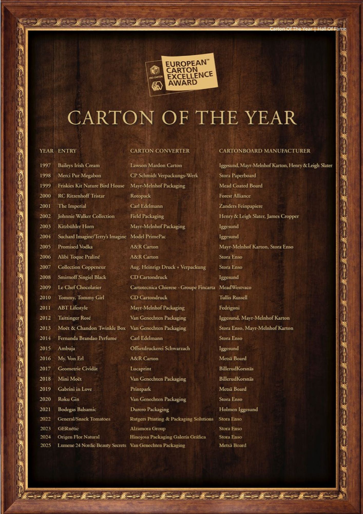 The Hall of Fame features all the winners of the Carton of the Year in the European Carton Excellence Award.