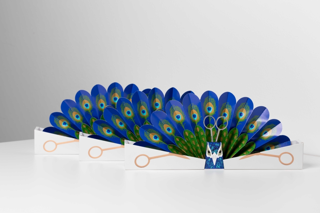 The effect of surprise while opening is enhanced by the contrast of the minimalistic outside and the illustrative inside of the box, with the peacock as the embodiment of beauty and unfolding.