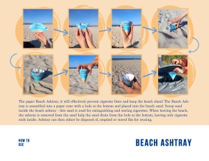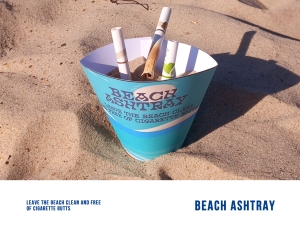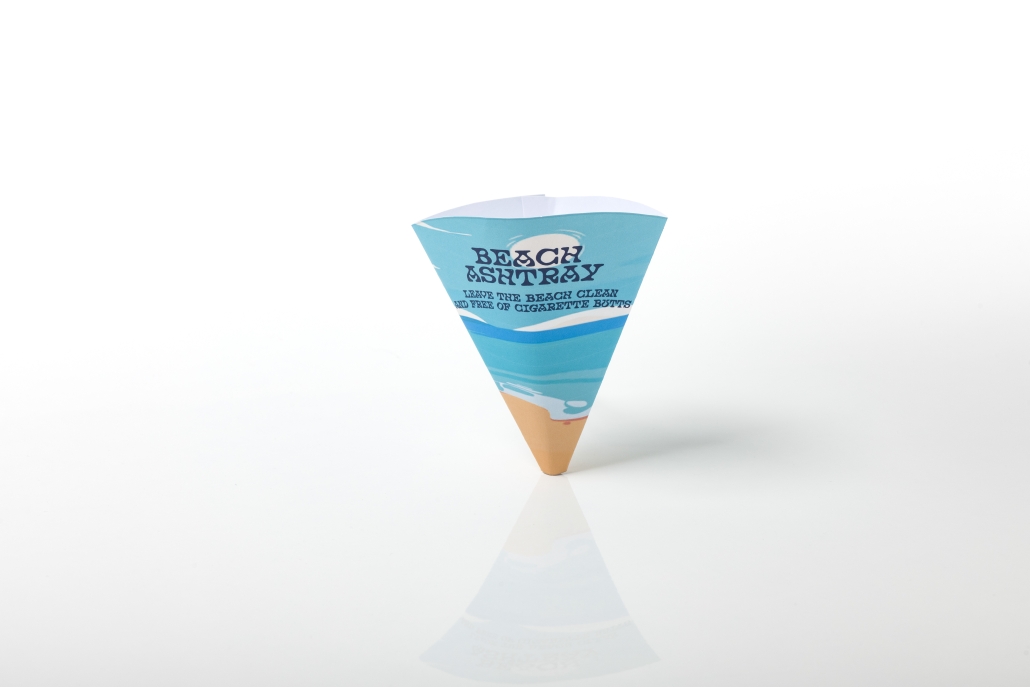 The Paper Beach Ashtray will effectively prevent cigarette litter and keep the beach clean! The Beach Ashtray is assembled into a paper cone with a hole at the bottom and placed into the beach sand. Scoop sand inside the Beach Ashtray – this sand is used for extinguishing and storing cigarettes. When leaving the beach, the ashtray is removed from the sand to help the sand drain from the hole at the bottom, leaving only cigarette ends inside. The ashtray can then either be disposed of, emptied or stored flat for reuse.