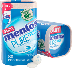 "This design for Mentos gum has found a gap in the market for confectionary; it is extremely functional, offers a strong shelf presence, and supports the brand's over-arching sustainability principles. Without the need for any plastic, it offers a smooth opening experience to the consumer with a flip top opening that stays open, and seals closed easily."