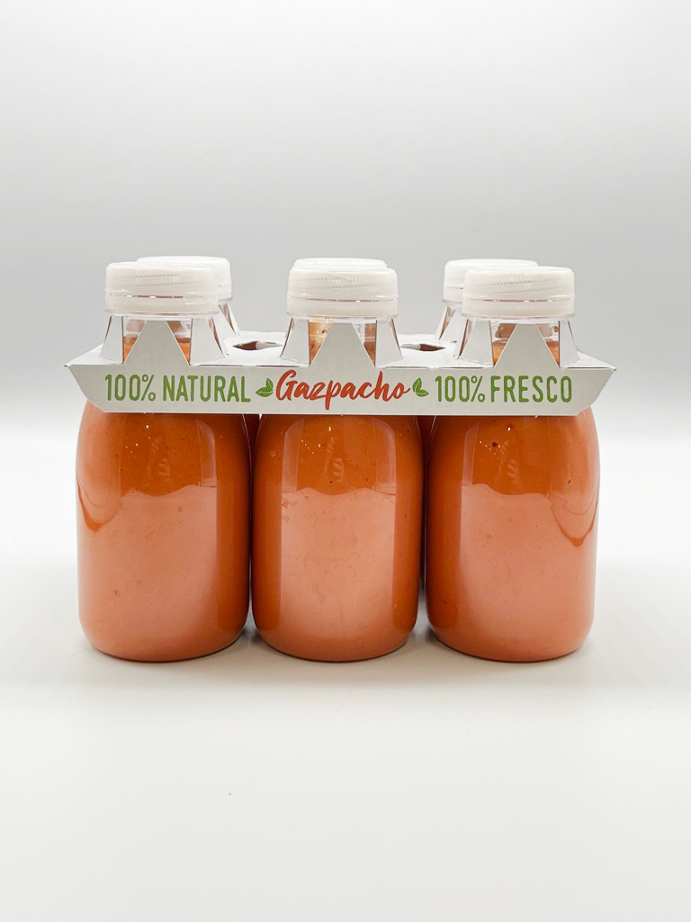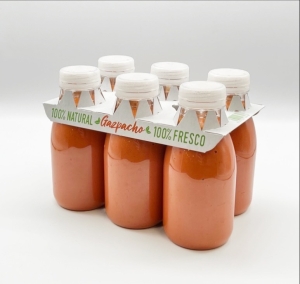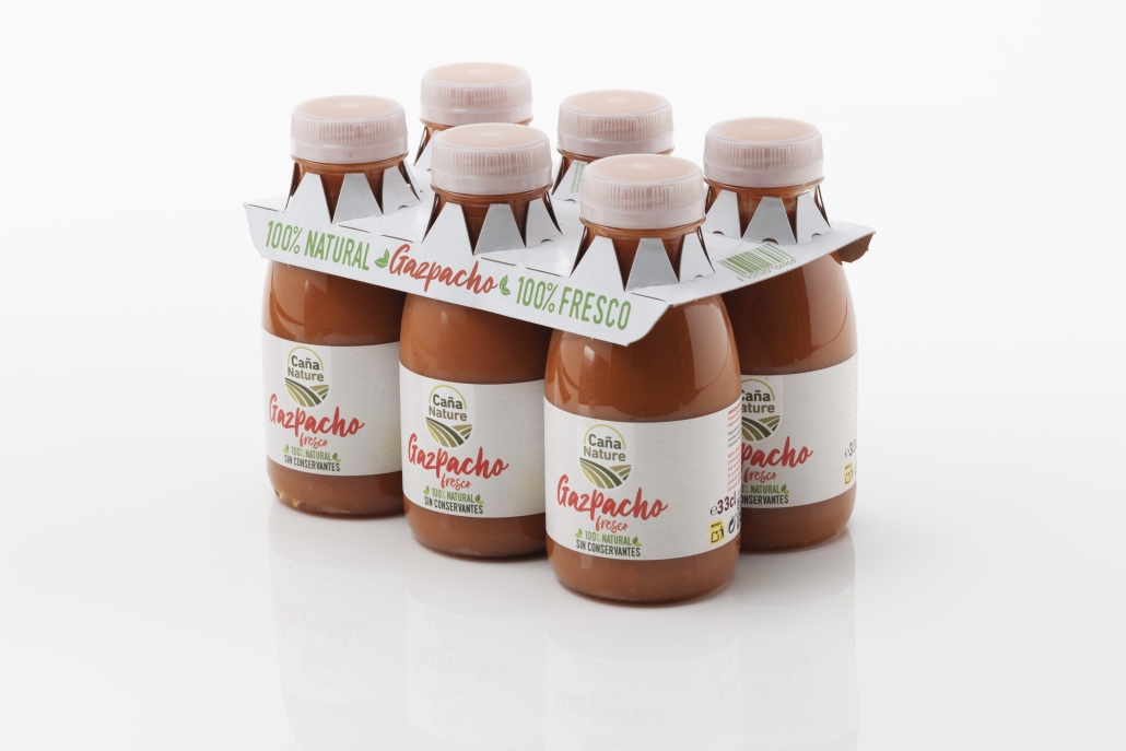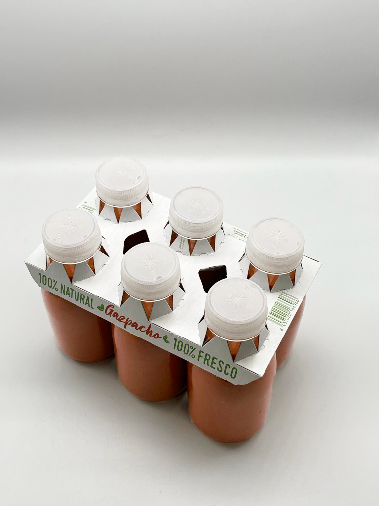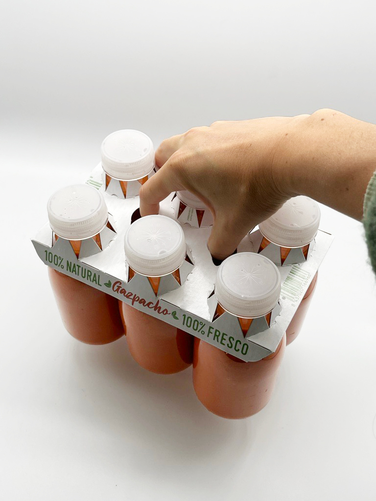 Caña Nature set out to launch its new Gazpacho and Salmorejo in 330ml PET bottles, sold in six-bottle multipacks per flavour. They were seeking a sustainable and minimalist packaging solution that would align with their premium positioning and values. PETCOLLAR® ECO PLUS proved the ideal choice – a fully paper-based, glue-free system made from Smurfit Westrock’s CarrierKote® board, designed for durability and recyclability.
