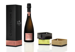 This box is actually a generic premium box for the entire range. It can be used for all the different types of champagne in the Cuvée Collection. Adding a small extra bottom element which easily locks on to the folding carton makes the packaging specific to the contents. This allows the cartons to be produced in a bigger run, avoiding extra tooling and set-up costs and waste. A combination of soft touch varnish with glossy elements and micro structures creates a high level of touch and feel.
