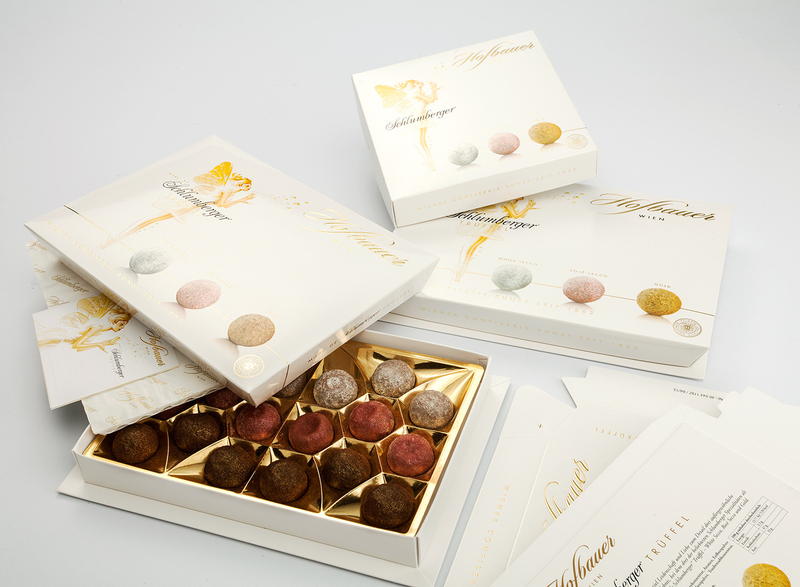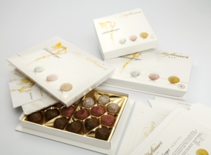 Exclusive combination of content and carton: both have gold dust application. Embossing on the outside also gives the product a tactile feeling. Filled truffles and skilful packaging combine to give a perfect symbiosis.