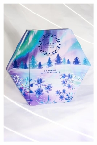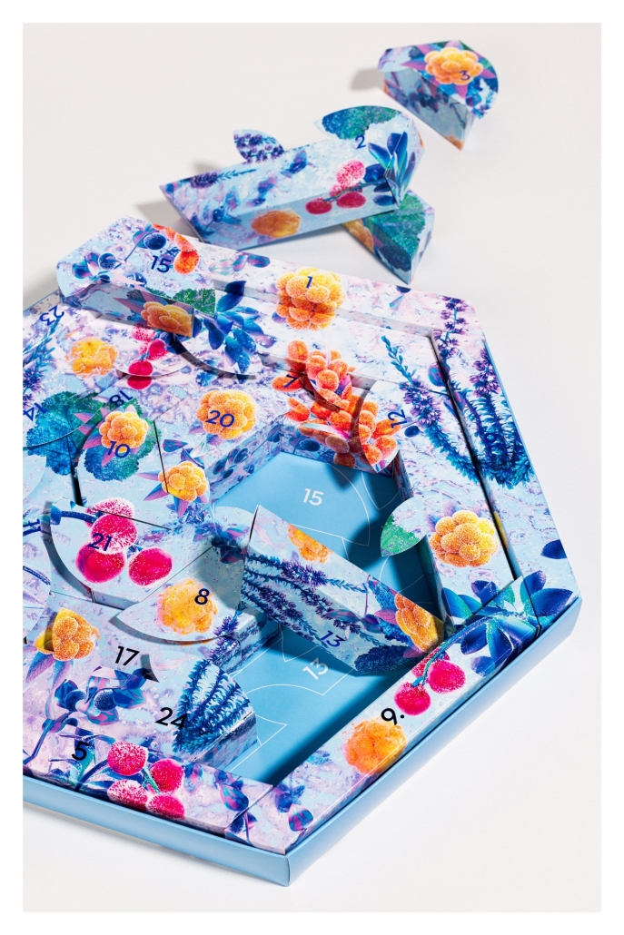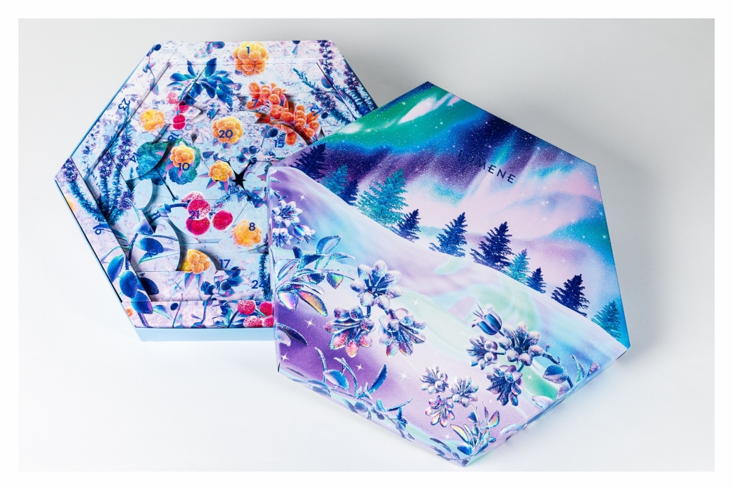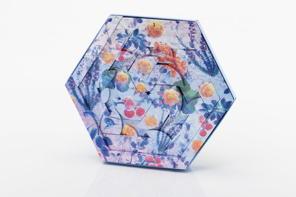 The Lumene 24 Nordic Beauty Secrets advent calendar draws inspiration from the traditional Adventskrans (Advent Wreath), reimagining it as a hexagonal tray filled with 24 puzzle-like boxes arranged in a spiral. Varying heights and overhanging edges add dimensionality and create a sense of discovery, while each box is precisely shaped to house its product, maximising product-to-pack ratio and eliminating excess space.