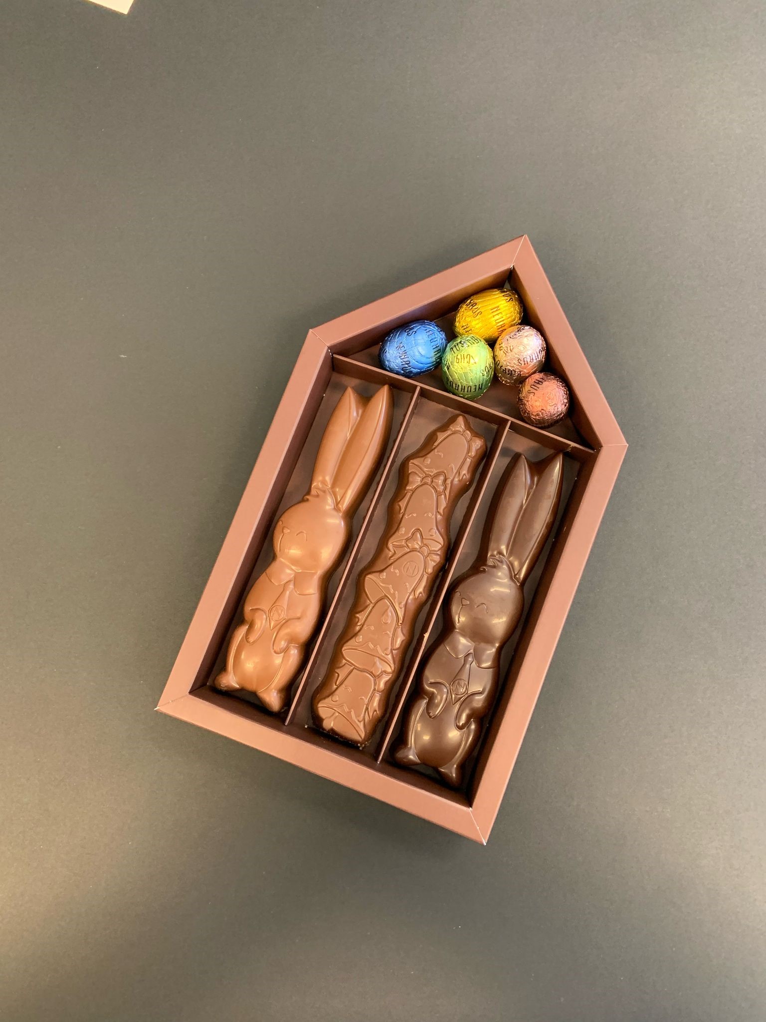 The Easter House Box is a seasonal gift that brings together design, sustainable innovation, and premium chocolate craftsmanship. Inside this charming house-shaped box, you’ll find three whimsical milk and dark chocolate figures filled with smooth almond praline, alongside five indulgent Easter eggs. Each bite showcases the refined textures and exceptional flavours created by our expert Maîtres Chocolatiers.
