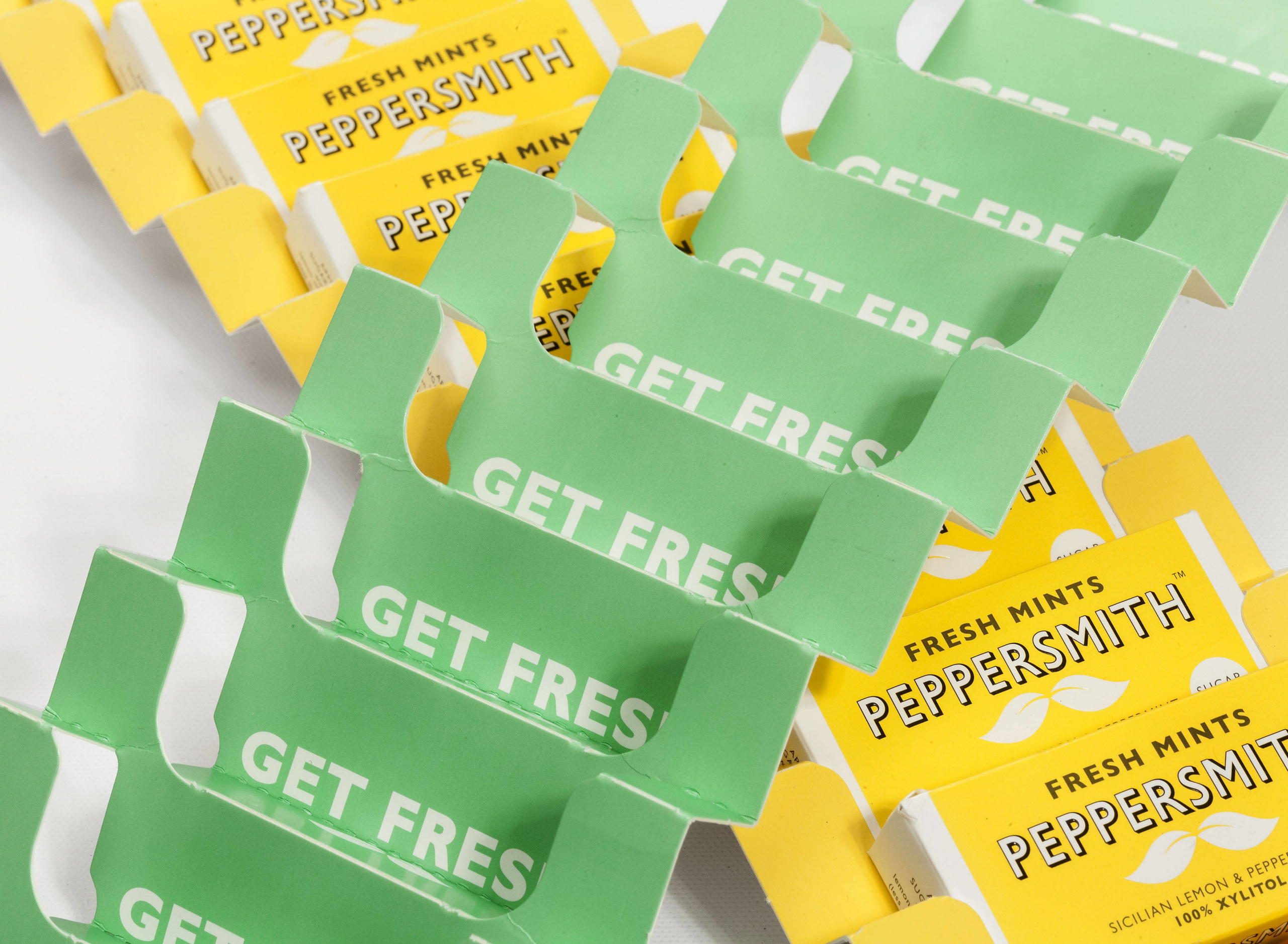 Peppersmith makes mints that taste good and look good. When pharmacy retailer “Boots” approached the company and wanted to stock their products, Peppersmith had a problem. Boots wanted the products but had no shelf space available. A bespoke concept with cartonboard was able to meet the requirements: a display strip. Alexir exclusively used FSC-certified cartonboard as well as high quality printing inks. The result: turnover was higher than for normal shelf placement.