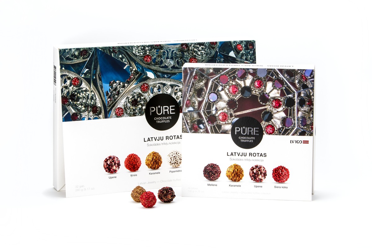 This series of exclusive boxes for various chocolate truffles were created especially for the 100-year anniversary of Latvia, in cooperation with the Latvian Culture Capital Foundation, which provided pictures of traditional jewellery used in the artwork. The series consists of three different shaped boxes – designed to inspire patriotic feelings – all are developed for easy and fast manual packing.