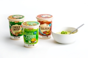 Usually this type of product is packed in plastic cups with a plastic lid. The challenge was to develop a paper cup that could be hot filled (80 °C), be stored chilled, provide 42 days shelf-life – and be microwaveable! These requirements were fulfilled through a customised coating, a flat rim with wide sealing area (for the membrane) and a strip to protect the inner side-seam. The paper-content is still 88%. The sealing membrane is protected by a paper-lid.