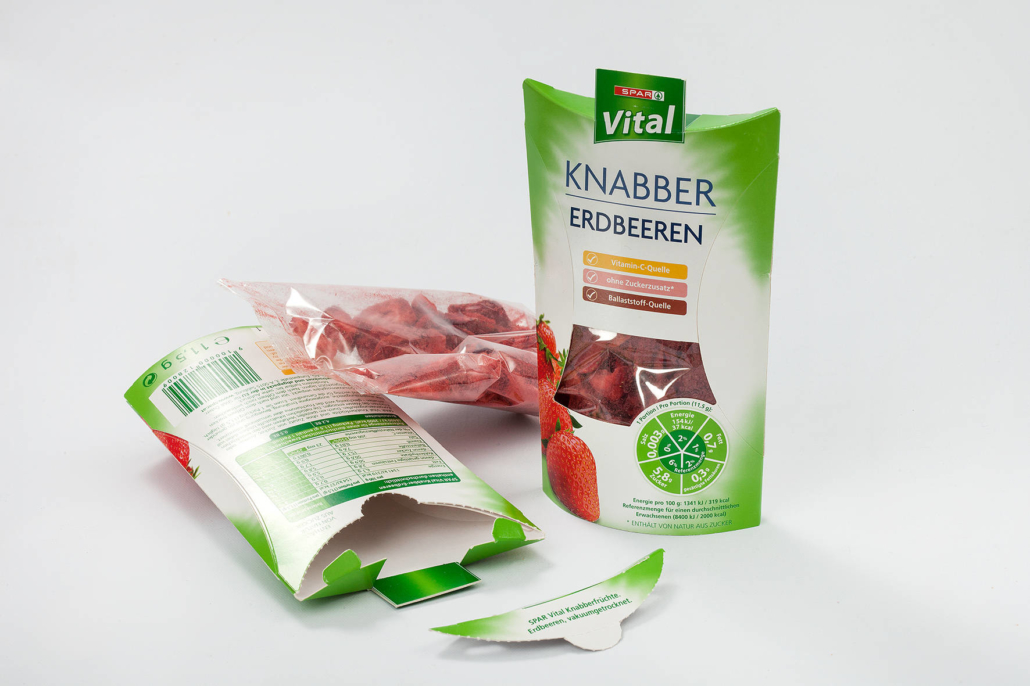 The lightness of the product is reflected by its shape. The carton and its narrow profile with window cut-out on the front communicate: enjoy a nibble with no regrets. The top of the carton is convenient to open. The requirement for an environment-friendly pack without additional adhesive was achieved with this solution made of cartonboard. The original plastic packaging was substituted, while the shape remained the same.